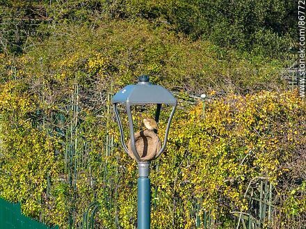 Vista aérea de un hornero construyendo un nido adentro de un farol frente al Rosedal | Foto #86772
