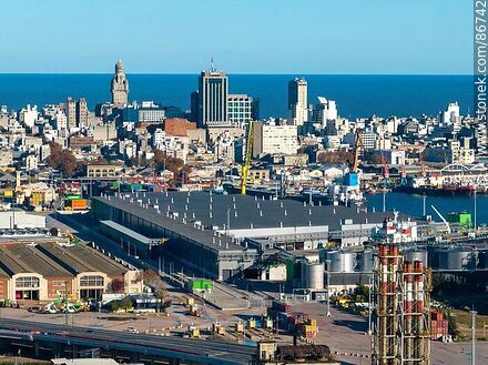 Aerial view of UPM cargo terminal at the port, Palacio Salvo, Radisson Victoria Plaza hotel, Executive Tower