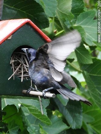 Tordo renegrido macho visitando un nido de ratonera
