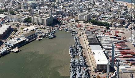 Vista aérea de la playa de contenedores. Buques de la Armada. Terminal de pasajeros.