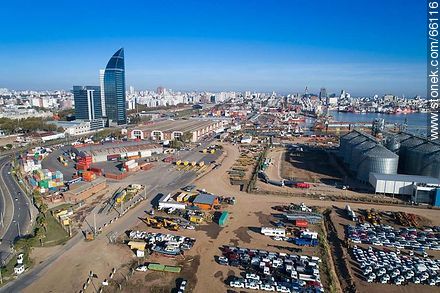 Foto aérea del puerto. Acopio granelero y vehículos importados