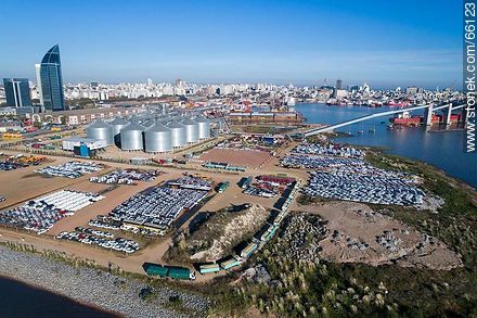 Foto aérea del puerto. Acopio granelero y vehículos importados