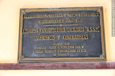 Antigua estación de trenes de Río Branco. Placa en referencia a la construcción del tramo desde Treinta y Tres | Foto #74603
