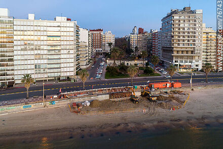 Vista aérea de la rambla República del Perú y Plaza Gomensoro antes de la salida del sol. Trabajo de reparación del muro de la playa | Foto #76743