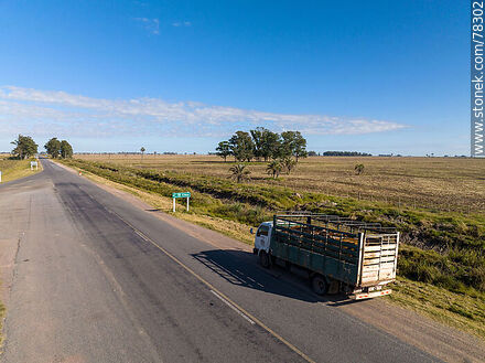 Vista aérea de un camión con ganado estacionado en la banquina. Rutas 15 y 19 | Foto #78302