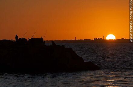 Silueta de pescadores con el sol desapareciendo por debajo del horizonte. A lo lejos el ex frigorífico Swift en el Cerro | Foto #79056