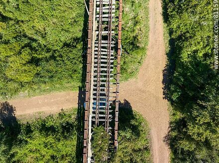 Vista aérea del antiguo puente ferroviario sobre el río Arapey Grande. Oxidados rieles sobre vetustos durmientes de madera | Foto #81159