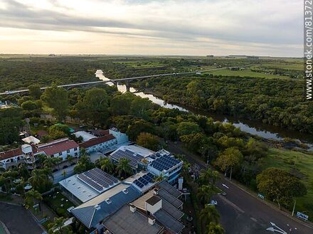 Vista aérea de las Termas del Daymán. Hoteles y cabañas. Puente sobre el río Daymán. Paneles solares | Foto #81372