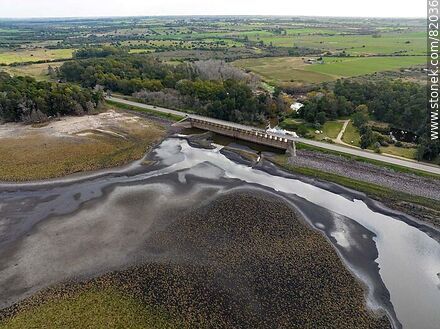 Vista aérea de la represa y puente en la Ruta 5 sobre el arroyo Canelón Grande durante la sequía del año 2023 | Foto #82036