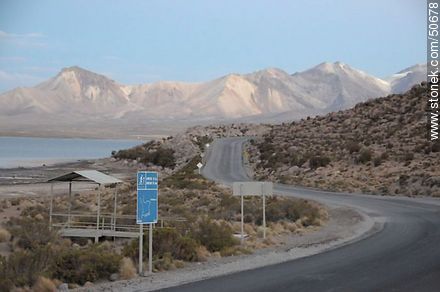 Mirador del lago Chungará en la ruta 11. Nevados bolivianos de Quimsachata, cerro Umurata, volcanes