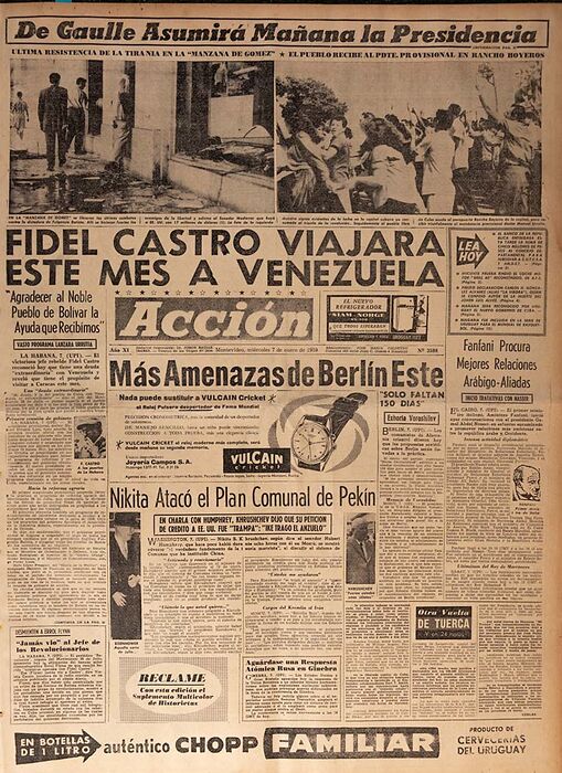Recorte del diario Acción de 1959. "De Gaulle asumirá la presidencia", "Fidel Castro viajará a Venezuela"