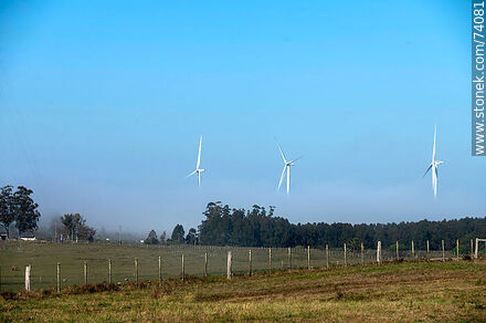 Molinos de energía eólica emergiendo de la niebla matutina próximos a la estación Pampa en Ruta 5