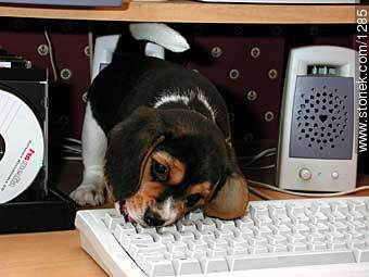 Palabras clave o etiquetas contenidas en las fotos de esta página: perro  beagle  cachorro  juego  jugando  computadora  teclado  parlante  mordisco  trompa  hocico
