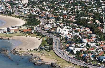 Vista aérea de la serpenteante rambla O'Higgins de Montevideo en Punta Gorda. Playas La